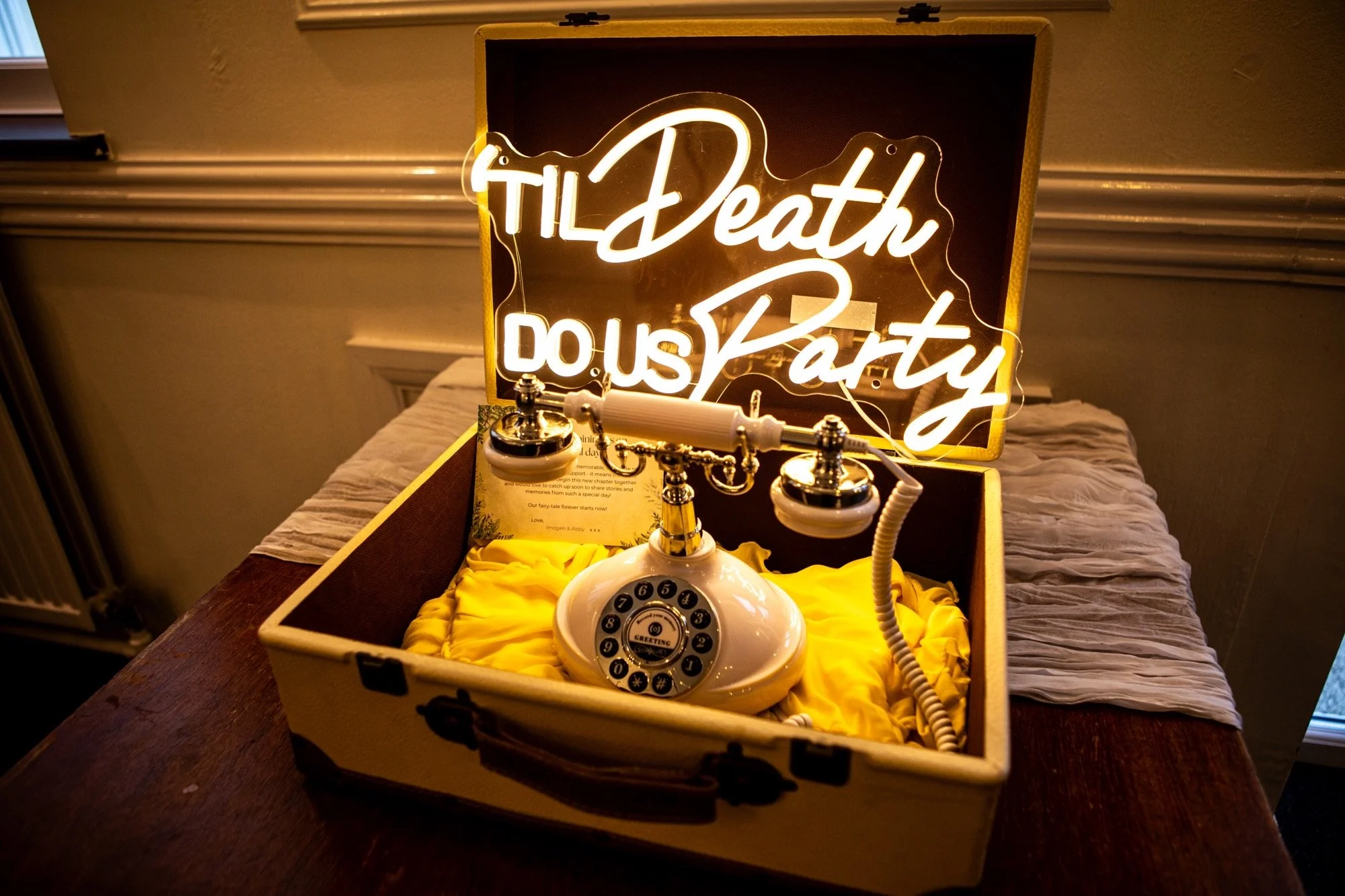Included is a vintage style suitcase set up with instructions sign. All phone styles can come in white and black and some can be other colours too.